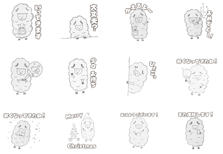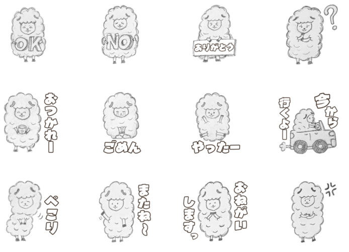 あえて鉛筆で描いたイラストをそのまま使い、色も付けませんでした。鉛筆の質感がスタンプでも伝わり、柔らかく温かい印象となっています。わずかな違いで表情が変わるため、メリーの目や口は線の長さや角度の細かなところまで気を配ってつくり上げました。32種類のスタンプには様々な場面で使いやすい「OK」、「ありがとう」、「お願いします」といった定番から、愛らしいメリーのイラストだからこそ伝えられるメッセージも入っています。