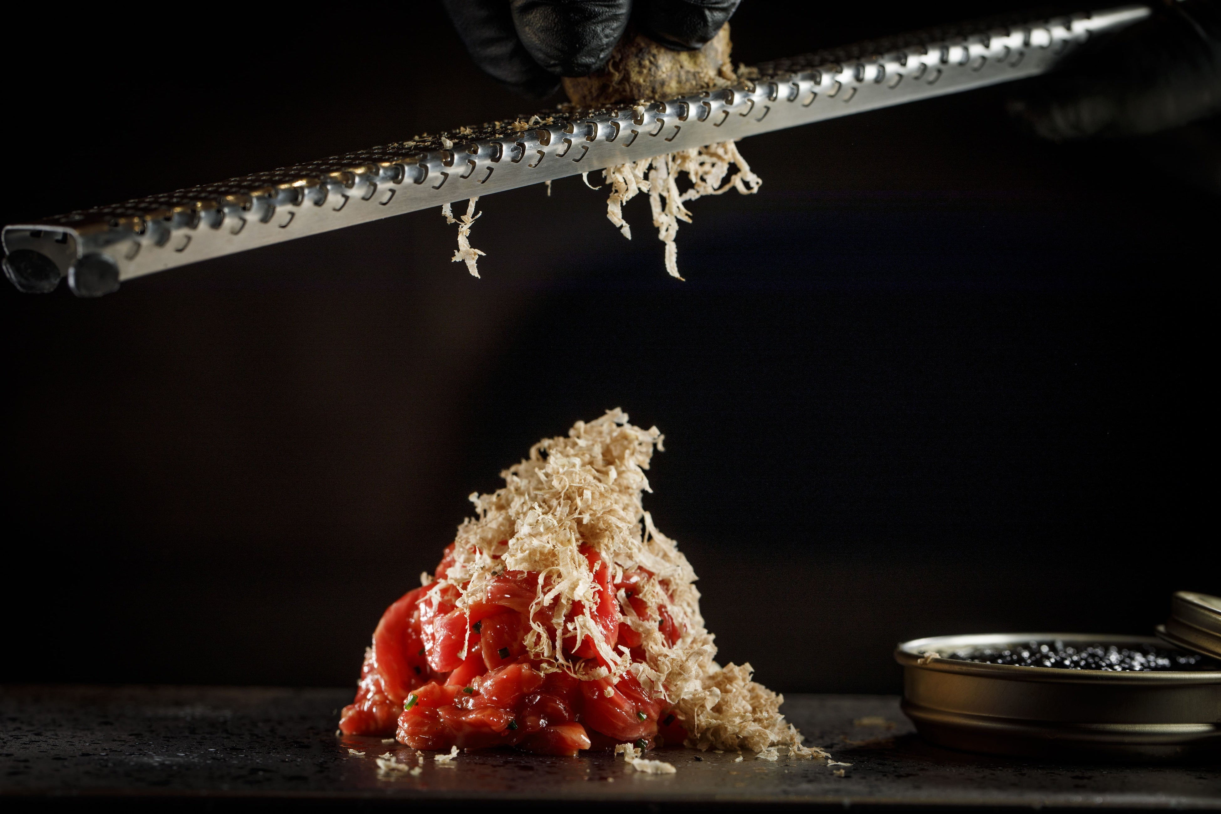 お店の看板メニューのユッケに削りたての白トリュフを散らしたリュクスな一品。ぜひシャンパーニュとともにお召し上がりください。