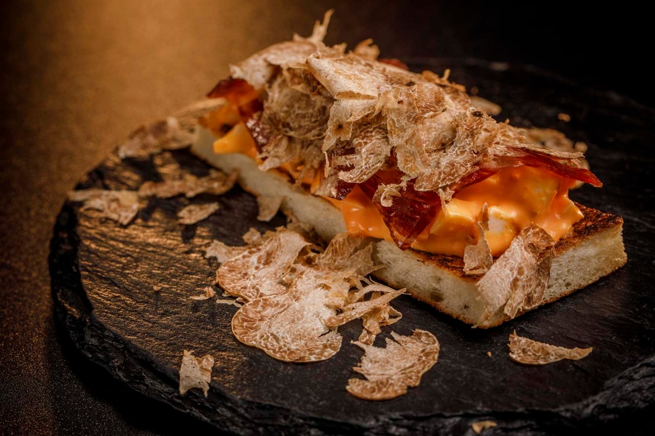 エシレバターをたっぷり使ってカリカリに焼き上げたパンに味付けした卵とベーコンを重ね、仕上げに白トリュフを散らした贅沢なオープンサンド。リッチな白トリュフがジャンクな味わいのオープンサンドと見事にマッチ!