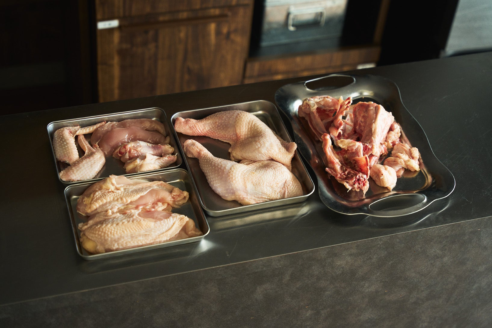 解体した国産丸鶏 部位によってとれる量のバランスが異なります。
