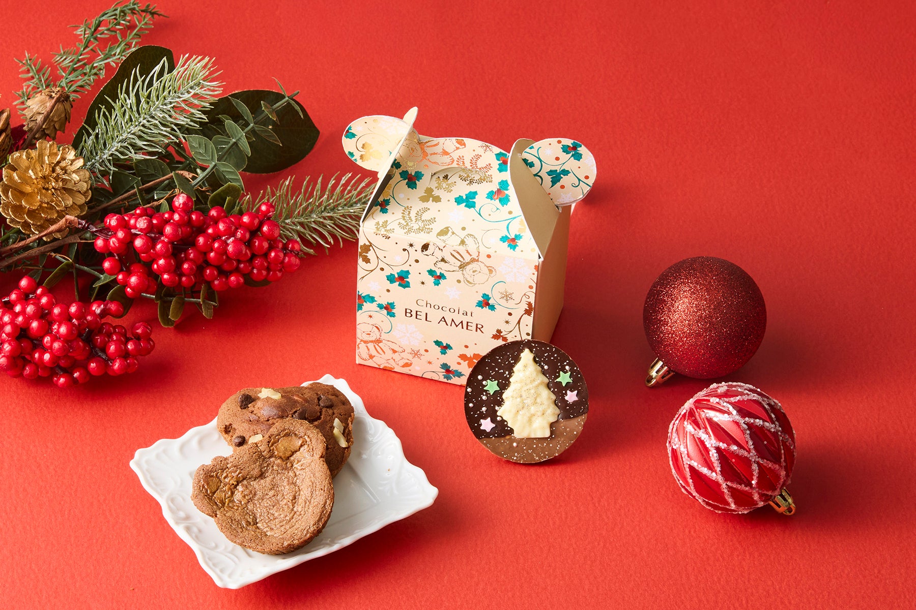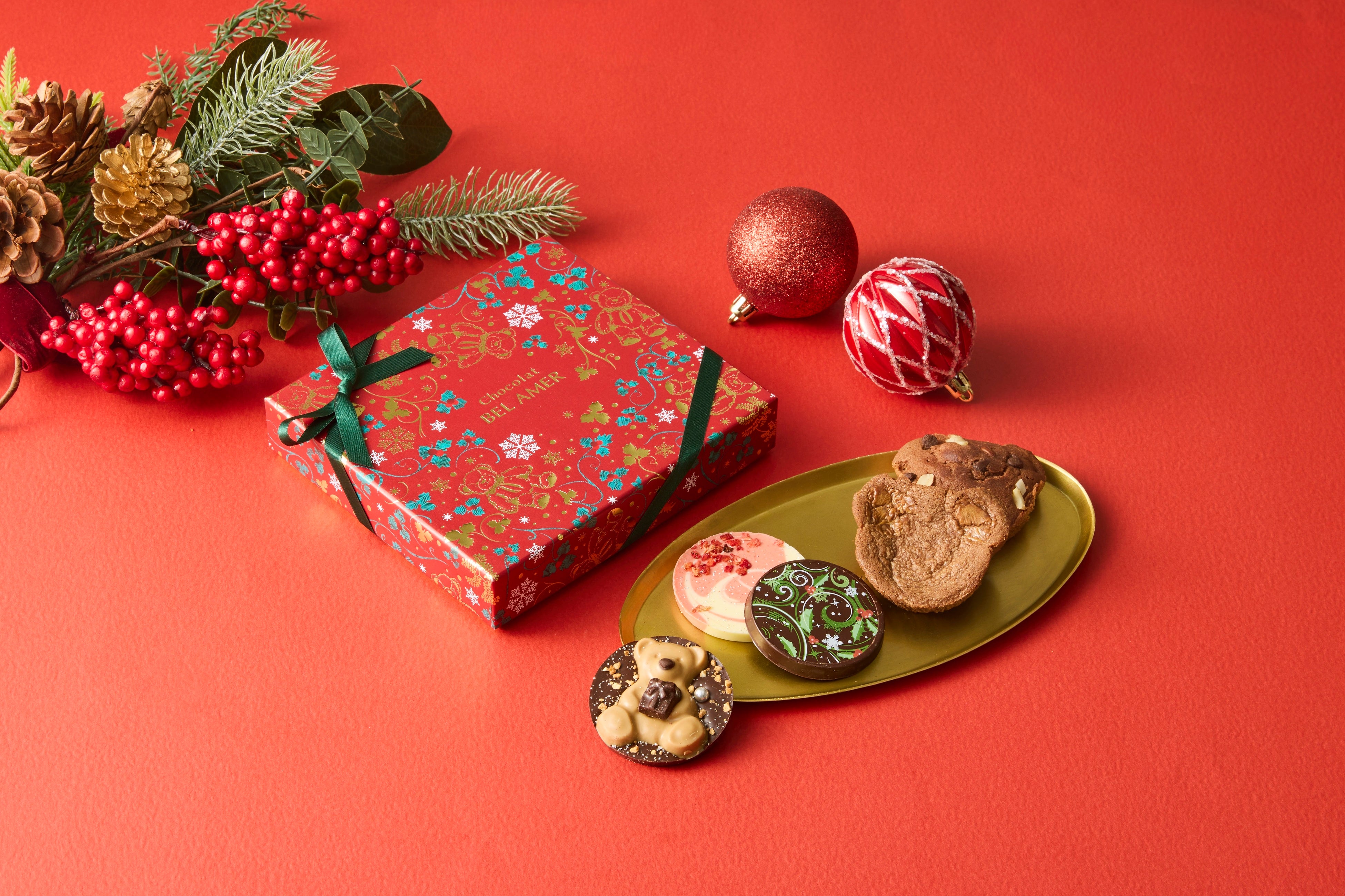 ショコラを使用したキュートなベア型の焼き菓子と、ベルアメールで人気のシグニチャー「パレショコラ」を詰め合わせました。クリスマス限定デザインのパレショコラには、ツリーや星などのモチーフがあしらわれ、見た目にも華やか。