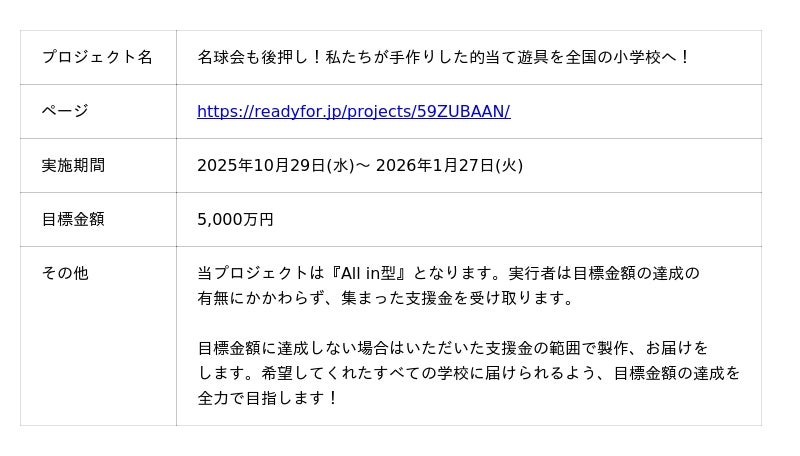 【全国1061校に届け!】日本プロ野球名球会も活用する“手作り的当て遊具”『59ZUBAAN!』を寄贈するクラウドファンディングが、10月29日にスタート