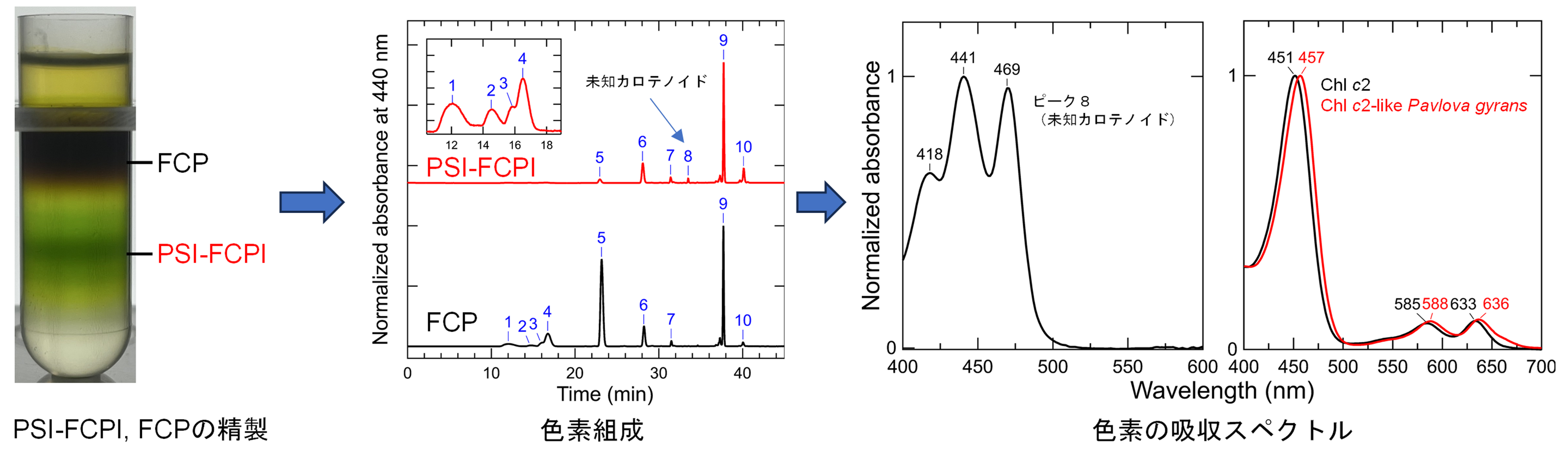 本研究では、この知識の空白を埋めるために、パブロバ属(Pavlovophyceae)のPSI-FCPIを精製・解析し、系統特異的な色素組成と分光学的特徴を明らかにしました。