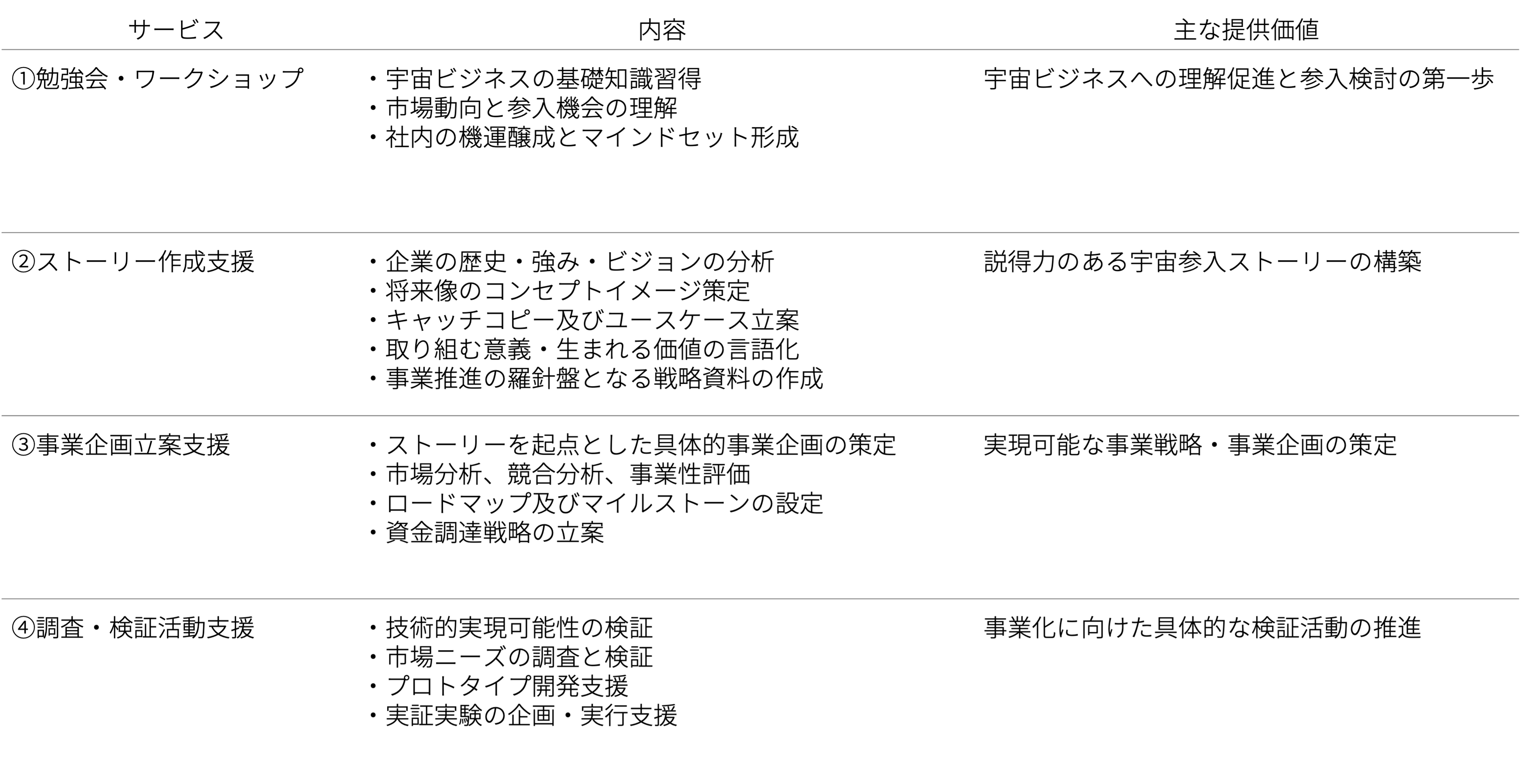 本サービスは、企業が宇宙ビジネスに参入する際の「なぜ我々が宇宙を目指すのか」という根本的な問いに答えるため、企業の歴史や強み、大切にしてきた価値観を紐解き、宇宙へと繋がる説得力あるストーリーを創出します。将来像のコンセプトイメージとキャッチコピーの策定から、具体的かつ論理的な未来のプロット及びユースケースの立案、取り組む意義や生まれる価値の言語化まで、事業開発を推進するうえでの羅針盤となるアウトプットを提供いたします。