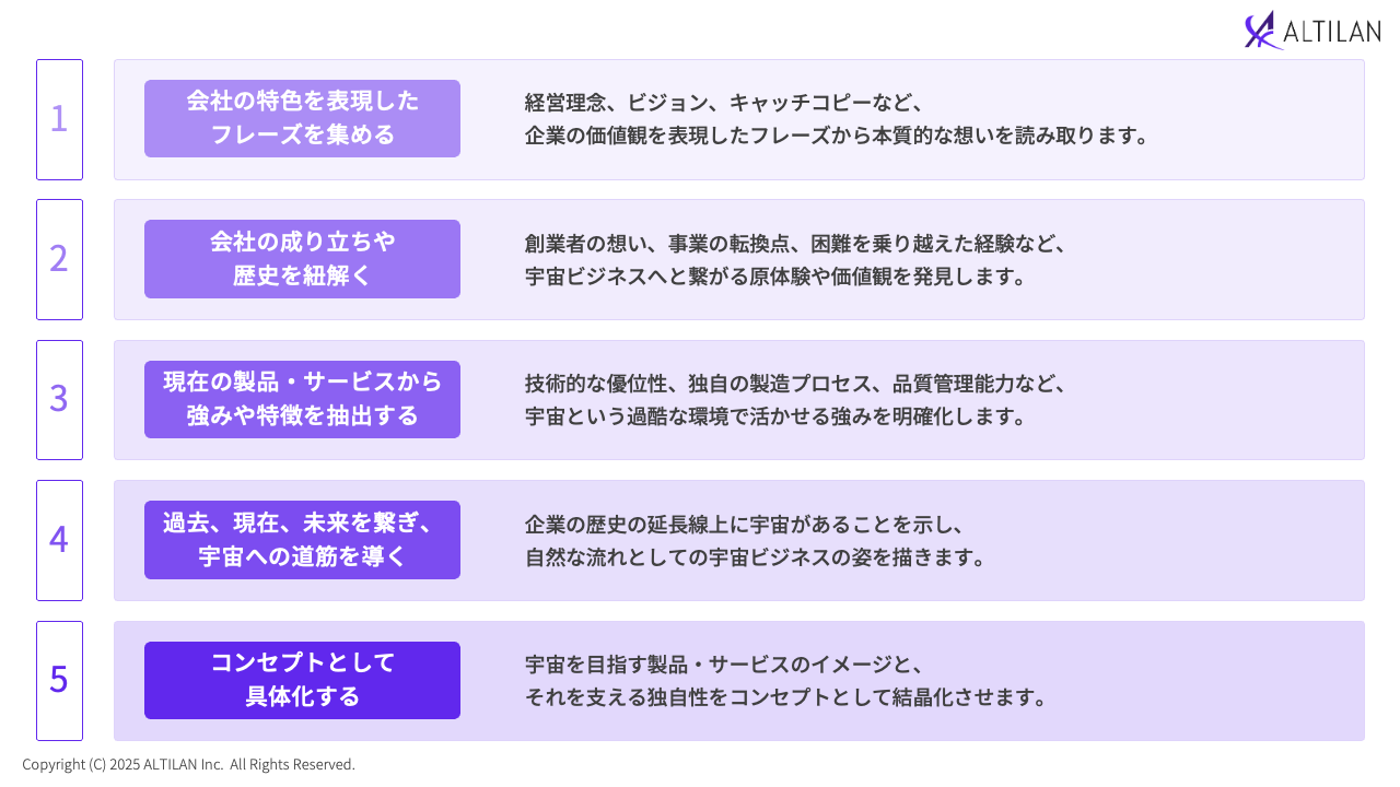 株式会社ALTILAN企業の歴史・強み・ビジョンからストーリーを紡ぎ、宇宙への道筋を描く。コンセプト及びビジュアルイメージの策定から事業企画・検証活動の推進まで、参入の羅針盤となるサービスをワンストップで提供