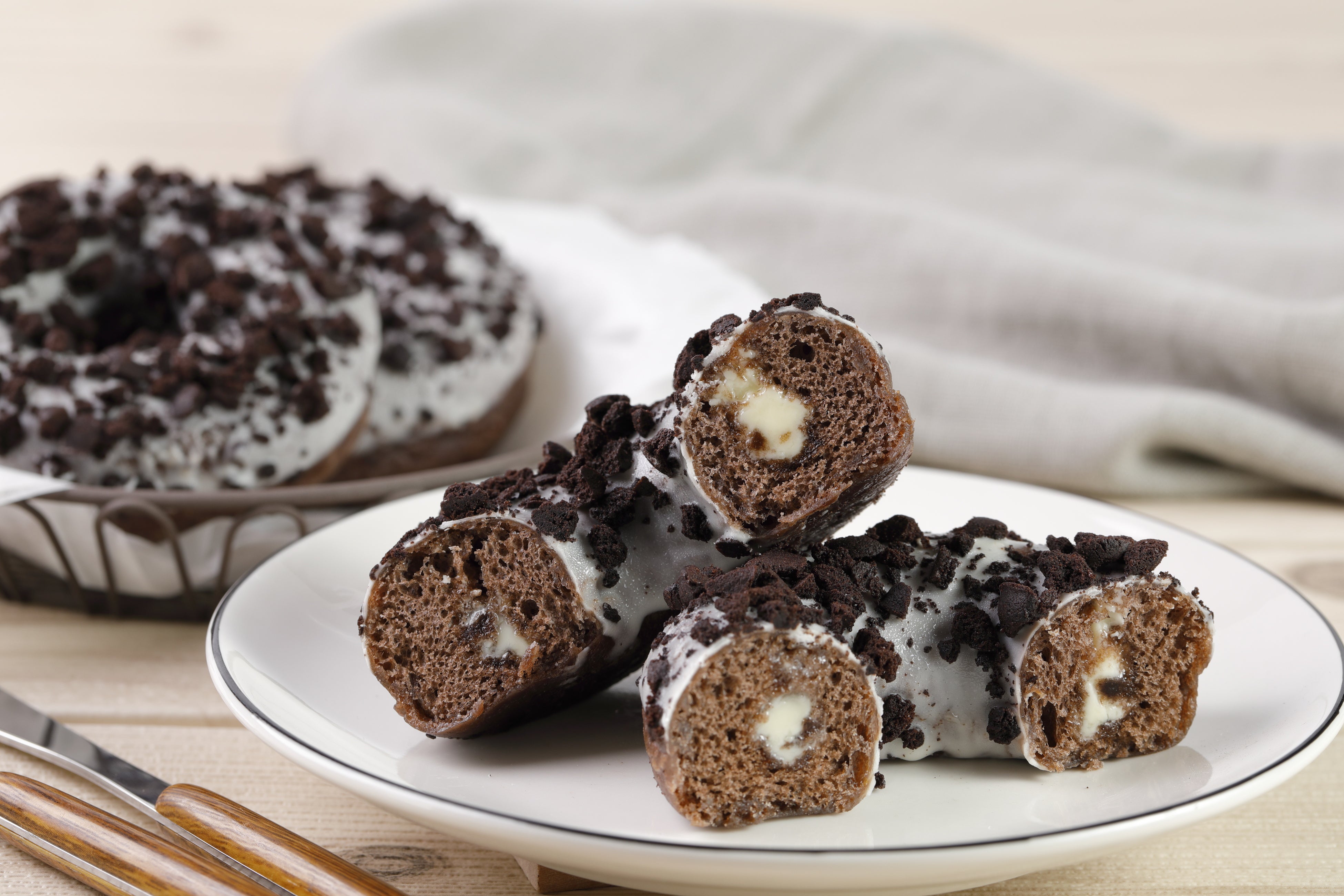 ミルククリーム入りのドーナツにココアクッキーをトッピングした食べ応え満点のドーナツです。