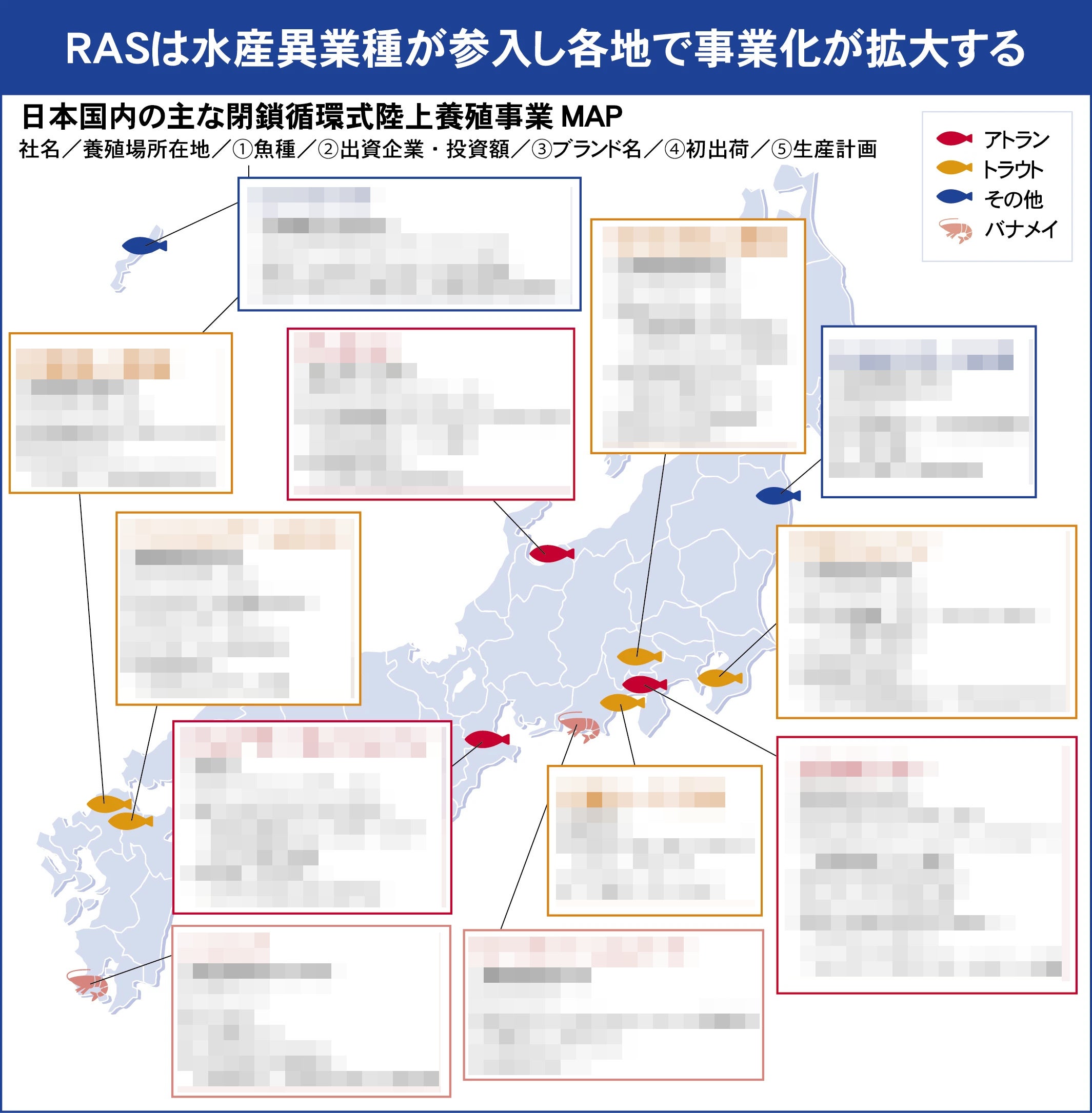 この記事には、日本国内で進行する主な陸上養殖プロジェクトを紹介する下のようなMAPが付きます。陸上養殖を手掛ける会社の名前、養殖場の所在地、対象魚種、出資企業と投資額、初出荷時期、生産計画といった情報が記載されています(記事を購入いただくと、伏字部分が読めます)。