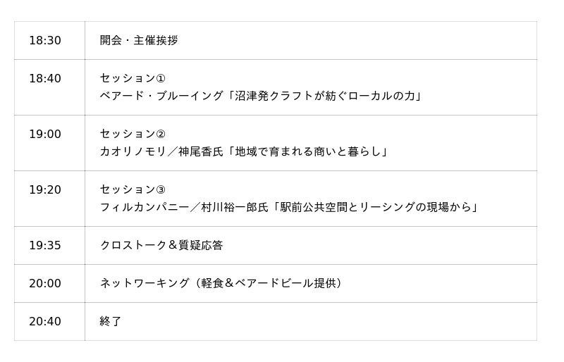 本イベントは、クラフトビール、小商い、公共空間、駅前再開発など、沼津の「今」動き出している現場の挑戦者たちが集い、街の未来について語り合う地域交流イベントです。Vol.1 では20名以上が参加し、地域で新たな挑戦をする人々のつながりを生みました。今回のVol.2では、よりスケールを拡大し、“食×小商い×まちづくり” のリアルを届けます。