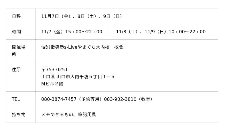 LIVE株式会社オンラインで東大生などの個別指導が受けられる個別指導塾s-Liveやまぐち大内校。開校前説明会は11月7日(金)~ 11月9日(日)の3日間開催。
