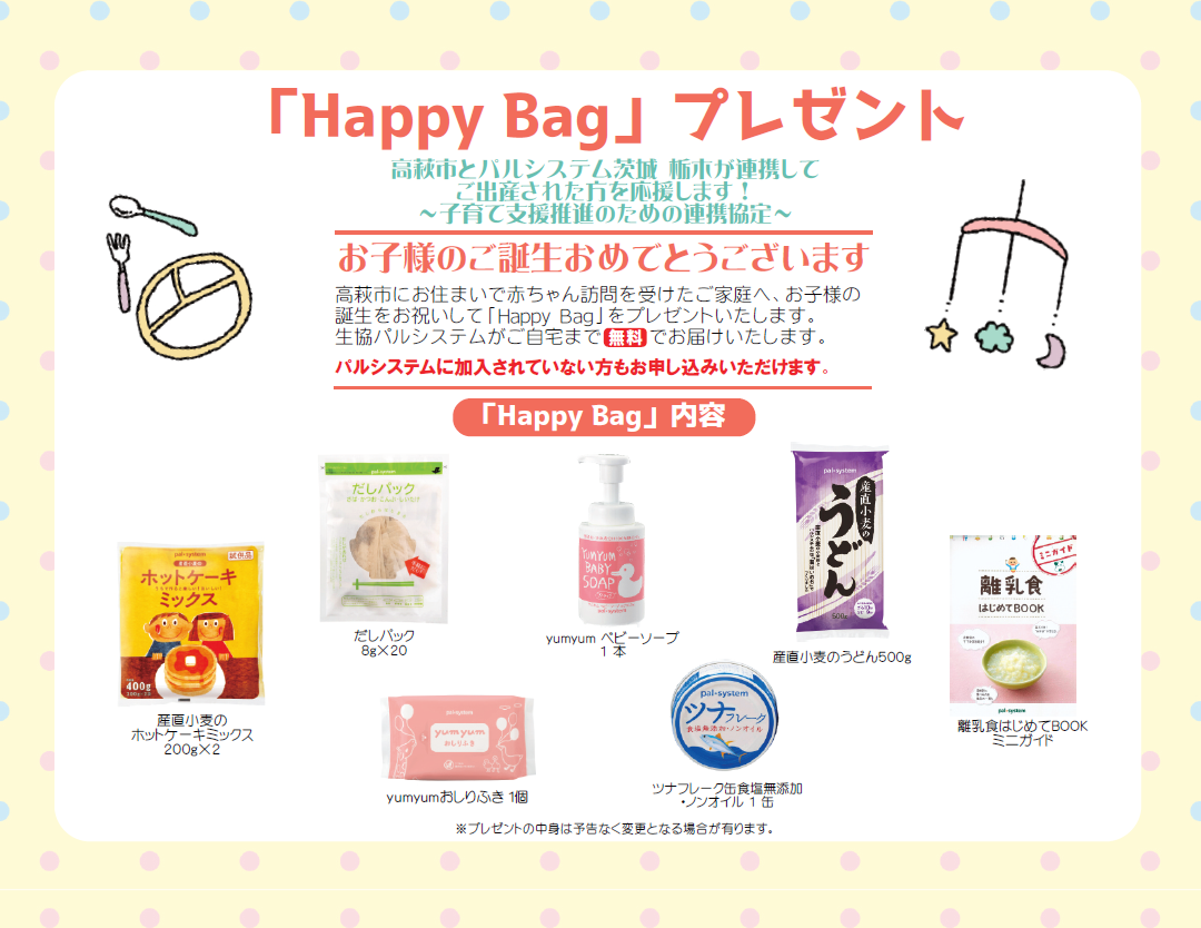 「子育て支援の推進に係る連携に関する合意書」に基づき高萩市は、助産師や保健師による乳児世帯への「赤ちゃん訪問」時に、出生祝いとして育児用品を詰め合わせた「Happy Bag」の案内カードを配付します。出生祝いは、パルシステムが宅配サービスで届けるベビーソープやおしりふき、離乳食づくりに役立つうどんやツナフレークなどの食材を詰め合わせます。