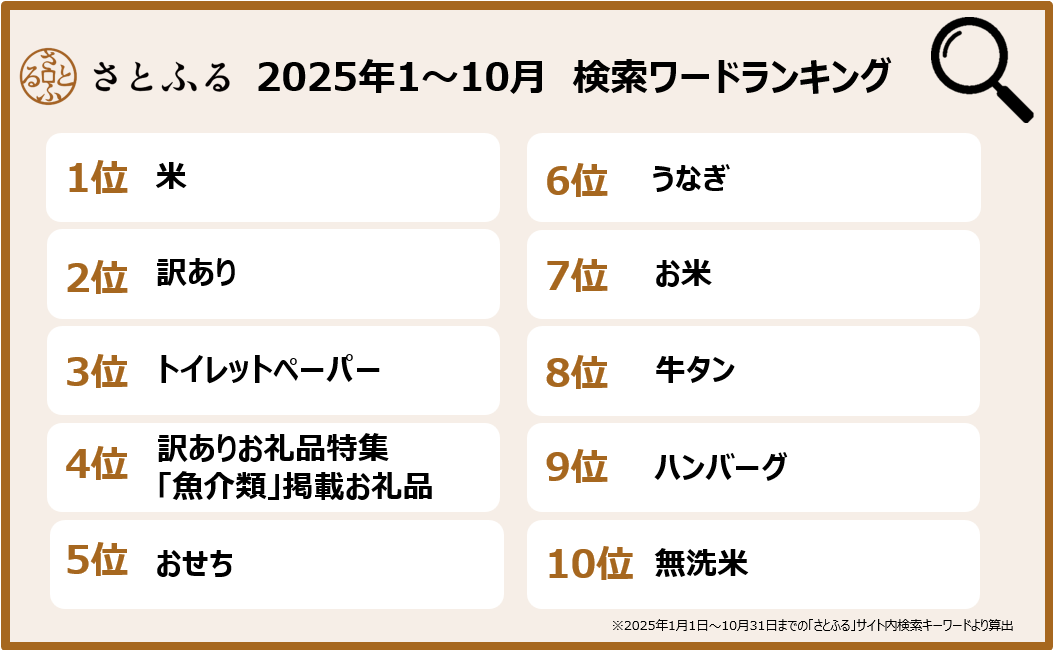「さとふる」における2025年1月~10月の検索キーワードランキングでは、1位「米」、2位「訳あり」、3位「トイレットペーパー」という結果になりました。いずれも、2023年から3年連続でTOP3にランクインしています。