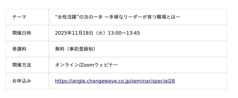 株式会社チェンジウェーブグループ企業のダイバーシティ推進などの支援を行う株式会社チェンジウェーブグループ(本社:東京都港区、代表取締役社長/CEO:佐々木裕子)は、2025年11月18日(火)に無料オンラインセミナー「“女性活躍”の次の一手~多様なリーダーが育つ職場とは~」を開催いたします。