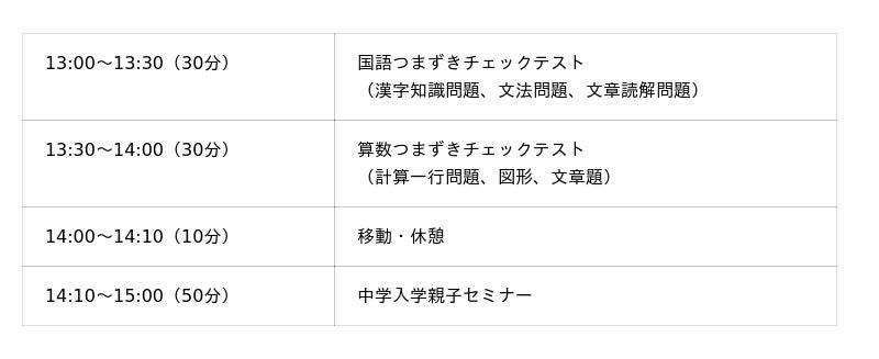 算数・国語のテストで、小学校で学習した内容のつまずきをチェックします。あわせて、中学入学親子セミナーでは、入学までに準備するべきことや定期テストや通知表で好成績をとるための秘訣をお伝えします。