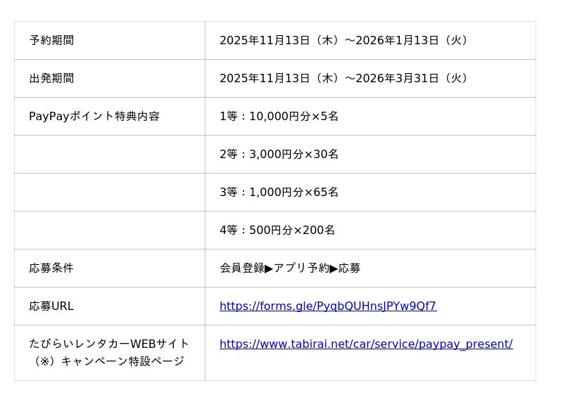 株式会社パム(本社:沖縄県那覇市、代表取締役社長:長嶺 由成)では、2025年11月13日(木)から2026年1月13日(火)の期間中、「たびらいレンタカーアプリ」にてキャンペーンを実施いたします。期間中に会員登録の上、アプリからレンタカーを予約後、キャンペーンへ応募した方を対象に、抽選で300名様に最大1万円分のPayPayポイントをプレゼントいたします。