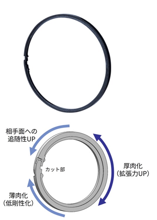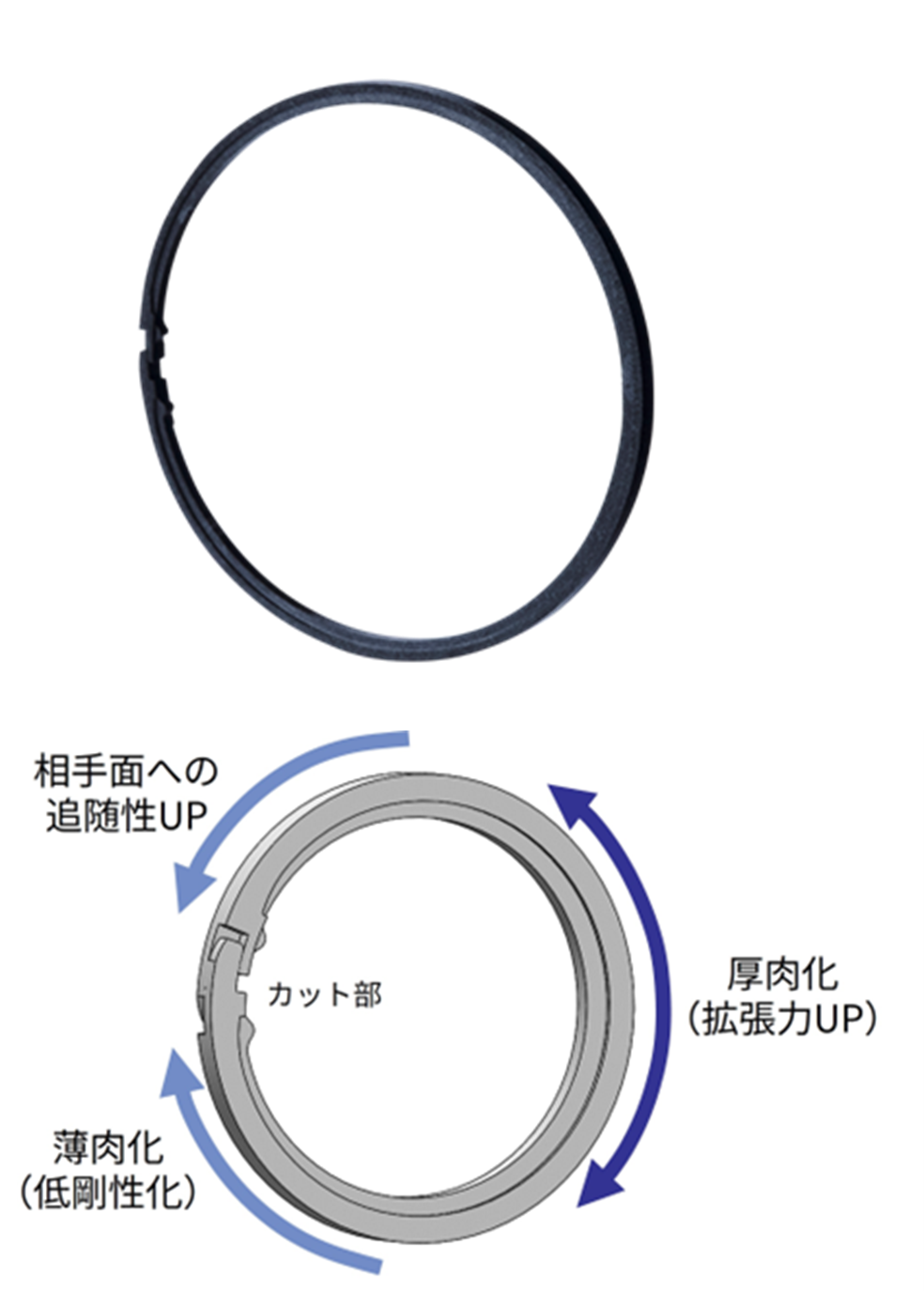 自動車のオートマチックトランスミッション(AT)や無段変速機(CVT)において、油圧を保持するために使用される回転用シールリングの形状設計に関する発明です。オイル漏れを低減するために、非対称(三日月)の形状に設計しています。シールリングの接合部周辺は厚みを薄くして剛性を抑え、反対側は厚みを持たせることで拡張力を高めています。この形状により、シールリング外周面に生じる隙間を低減し、ハウジングとの密着性が向上することで、最大80%のオイル漏れを低減します。高い密封性と耐久性を活かし、油圧の安定性を向上させ、異物の噛み込み防止にも効果を発揮します。
