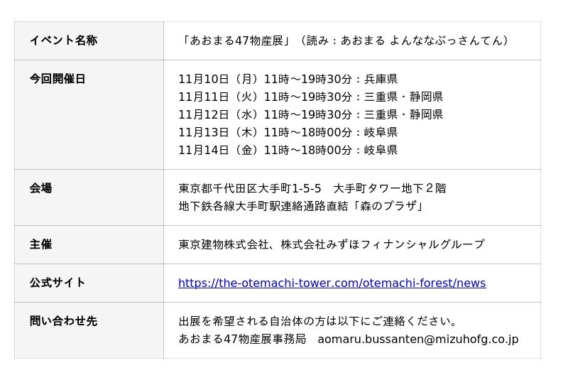 東京建物と〈みずほ〉で取り組む地域創生「あおまる47物産展」東京・大手町タワーで開催2025年11月は兵庫・三重・静岡・岐阜の名産品が集結