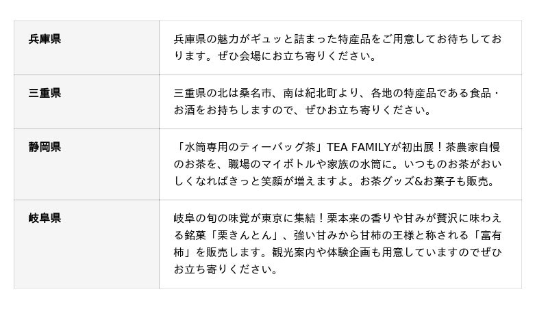 2025年11月は10日(月)~14日(金)の期間に、兵庫県・三重県・静岡県・岐阜県の名産品が出展されますので、お知らせします。
