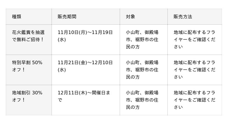 今回の「富士山花火vsスピードウェイ2026」のチケットは、ふるさと納税での早期受付、早割チケット、近隣在住の方を対象にした無料抽選や地域割引など、時期やエリアに合わせた販売を順次スタートします。