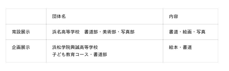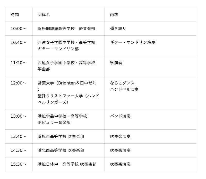 浜松市内の高校生による吹奏楽部等のステージパフォーマンスや絵画・書道等の作品展示、大学生・高校生によるワークショップ等を実施し、学生や保護者の皆様をはじめ多くの方々にお楽しみいただける内容となっております。