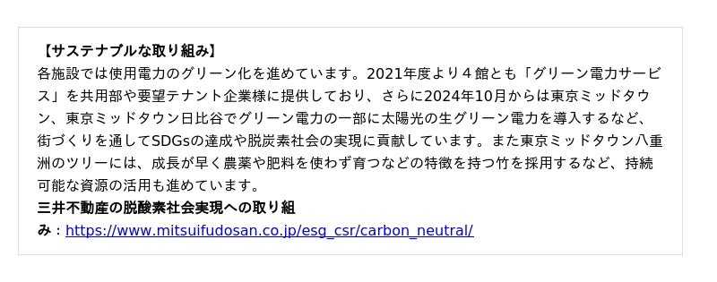 今週11月13日(木)からは東京ミッドタウン(六本木)、東京ミッドタウン日比谷、東京ミッドタウン八重洲の3施設で一斉にクリスマスイベントが、11月21日(金)からは日本橋エリアのクリスマスイベントがスタート。それぞれの街の個性を活かしたコンテンツが、冬のミッドタウンを明るく彩ります。また、施設毎にこうしたさまざまなクリスマスコンテンツをご用意しているだけではなく、各施設では使用電力のグリーン化を進めるなど、街づくりを通してSDGsの達成や脱炭素社会の実現にも貢献しています。