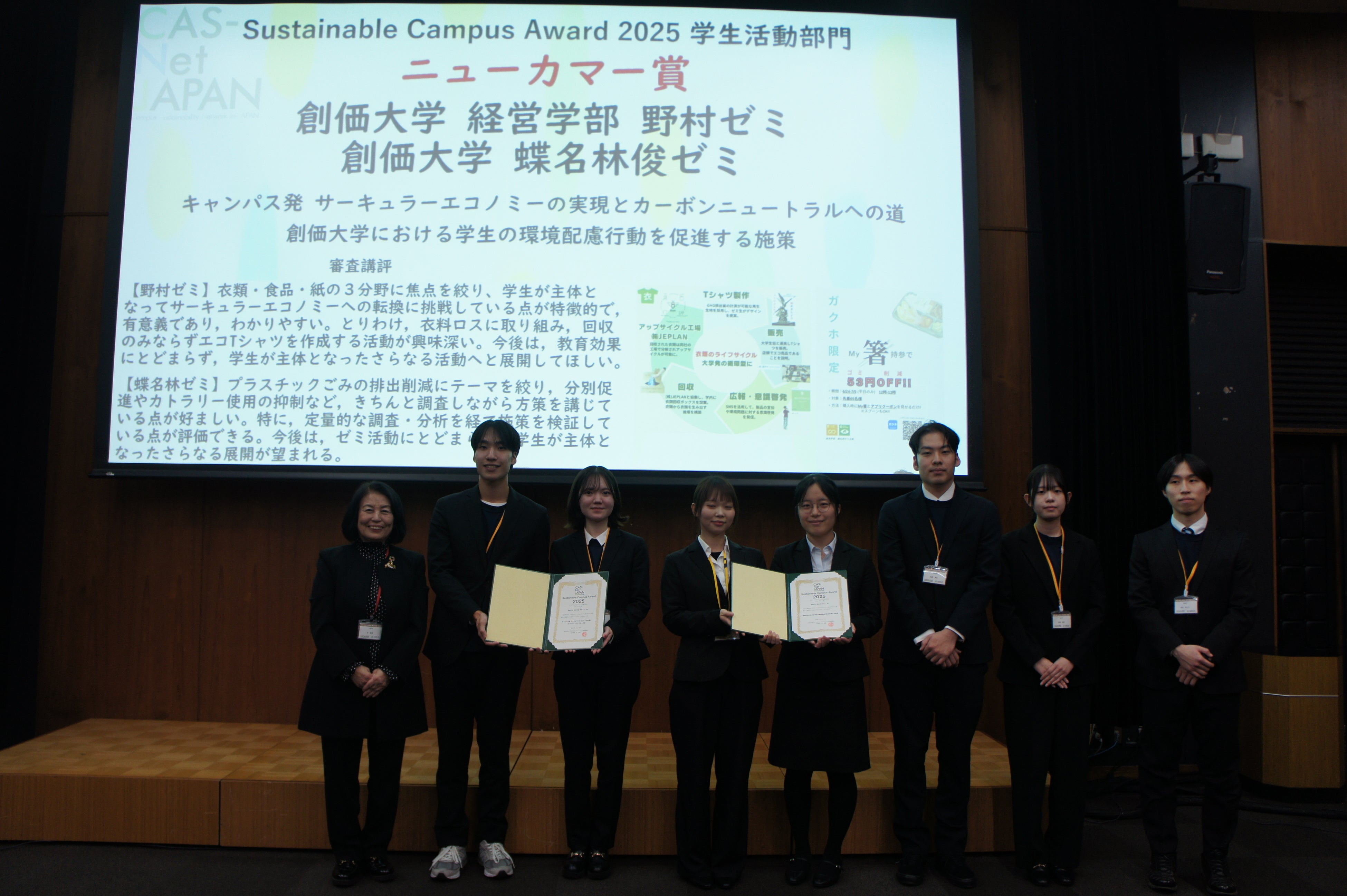 - 学生活動部門:ニューカマー賞 ー 創価大学 経営学部 野村ゼミ「キャンパス発 サーキュラーエコノミーの実現とカーボンニュートラルへの道」/創価大学 蝶名林俊ゼミ「創価大学における学生の環境配慮行動を促進する施策」