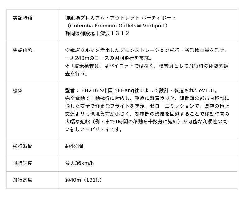 本デモフライトは、2025年5月に竣工した「バーティポート整備指針(令和5年12月 国土交通省航空局)を参考にして整備した東日本初※のバーティポートである「御殿場プレミアム・アウトレット バーティポート」を活用、国土交通省「令和6年度 バーティポート計画ガイドライン(仮称)」策定に向けた実証事業の一環として行ったものです。