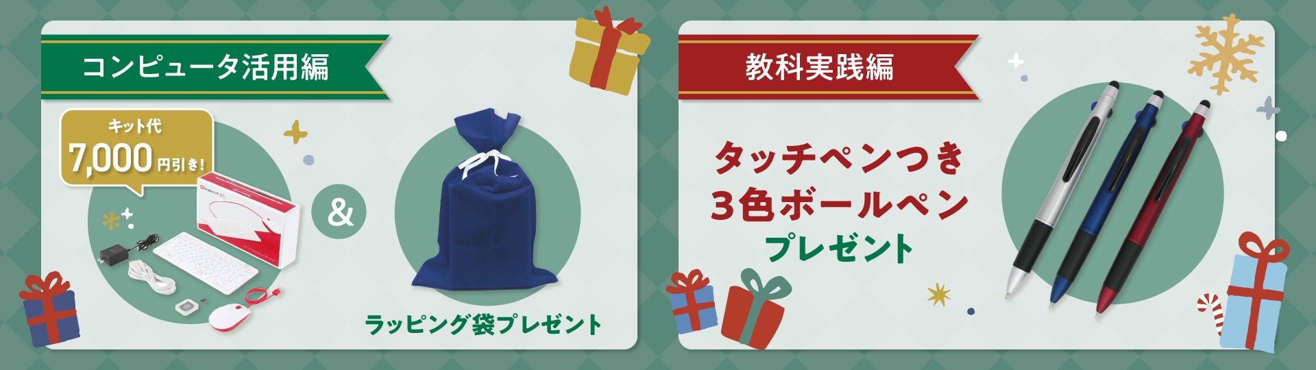 期間中に「コンピュータ活用編」にお申し込みいただき、同時にキットをご購入いただくと、Raspberry Pi 400キット(キット価格17,600円(税込))を7,000円引きの10,600円(税込)でご購入いただけます。