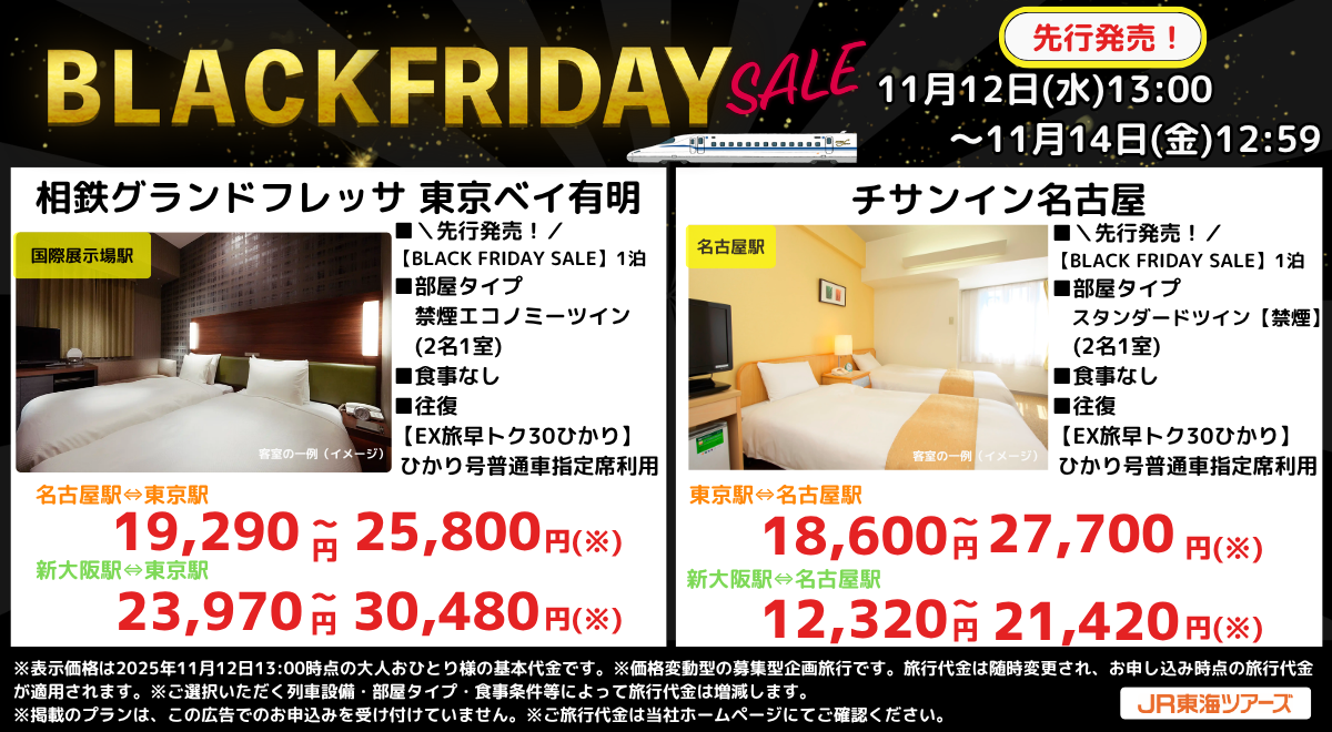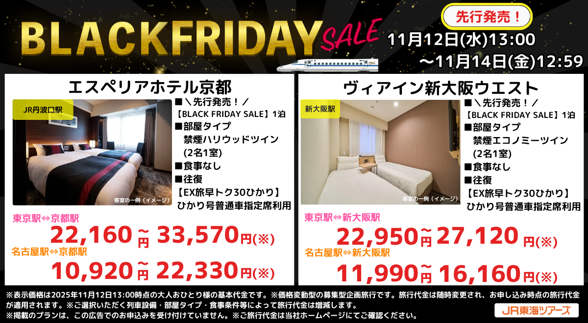 株式会社ジェイアール東海ツアーズ株式会社ジェイアール東海ツアーズ(本社:東京都中央区、以下JR東海ツアーズ)は、2025年11月14日(金)から12月1日(月)まで開催する「BLACK FRIDAY SALE」の一般発売に先駆け、LINEアカウント連携をしていただいている方を対象に、11月12日(水)13時から11月14日(金)12時59分までの期間限定で、先行発売いたしました。1月以降の「新幹線+ホテル」を使った旅行をいち早く予約できるチャンス!コスパ重視のホテルから憧れのラグジュアリーホテルまで多彩なラインナップ!一年に一度のお祭りセールで新幹線旅行をおトクに先取りできるこの機会をお見逃しなく!