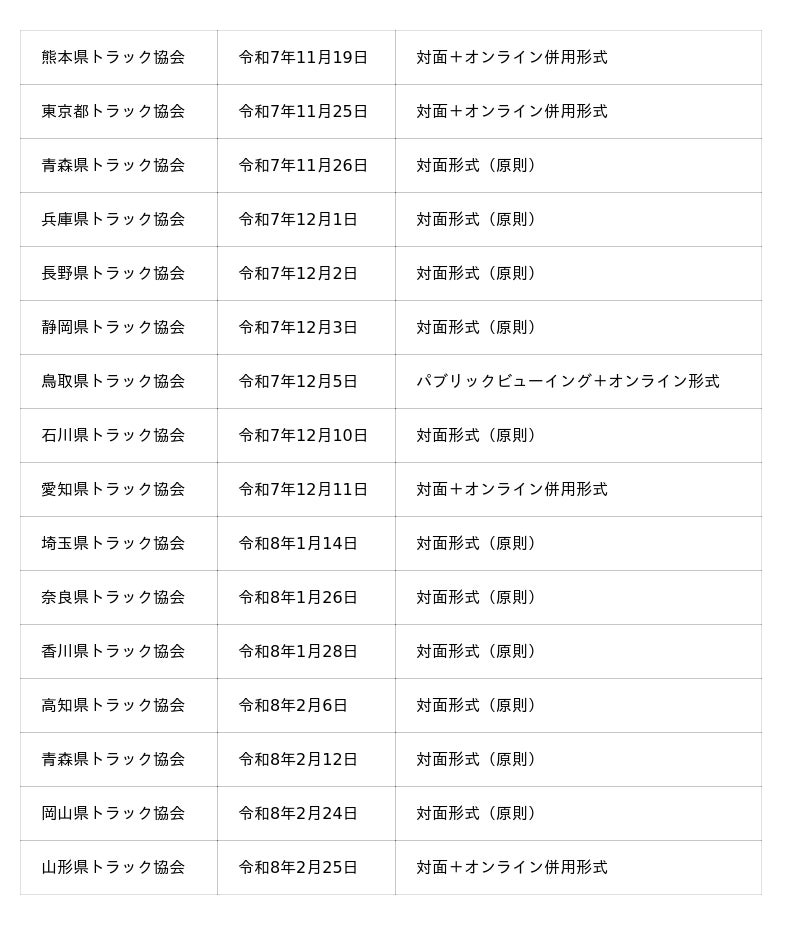 全ト協と各都道府県トラック協会の共催となる本セミナーは、以下の日程および形式で全国各地のトラック協会で開催されます。- セミナー名称: 令和7年度中小トラック運送事業者のためのDX推進セミナー