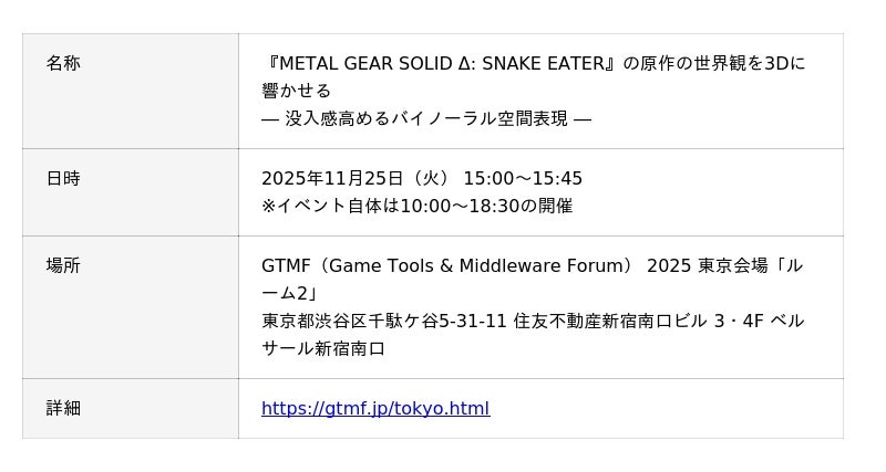 「METAL GEAR SOLID Δ: SNAKE EATER」における『Sound xR Core』を使ったサウンドデザインに関して、株式会社コナミデジタルエンタテインメントとヤマハ株式会社の開発メンバーによるセッションを、ゲーム開発者向けソリューションの総合イベント「GTMF(Game Tools & Middleware Forum)2025」東京会場で開催します。「GTMF2025」トークセッション概要