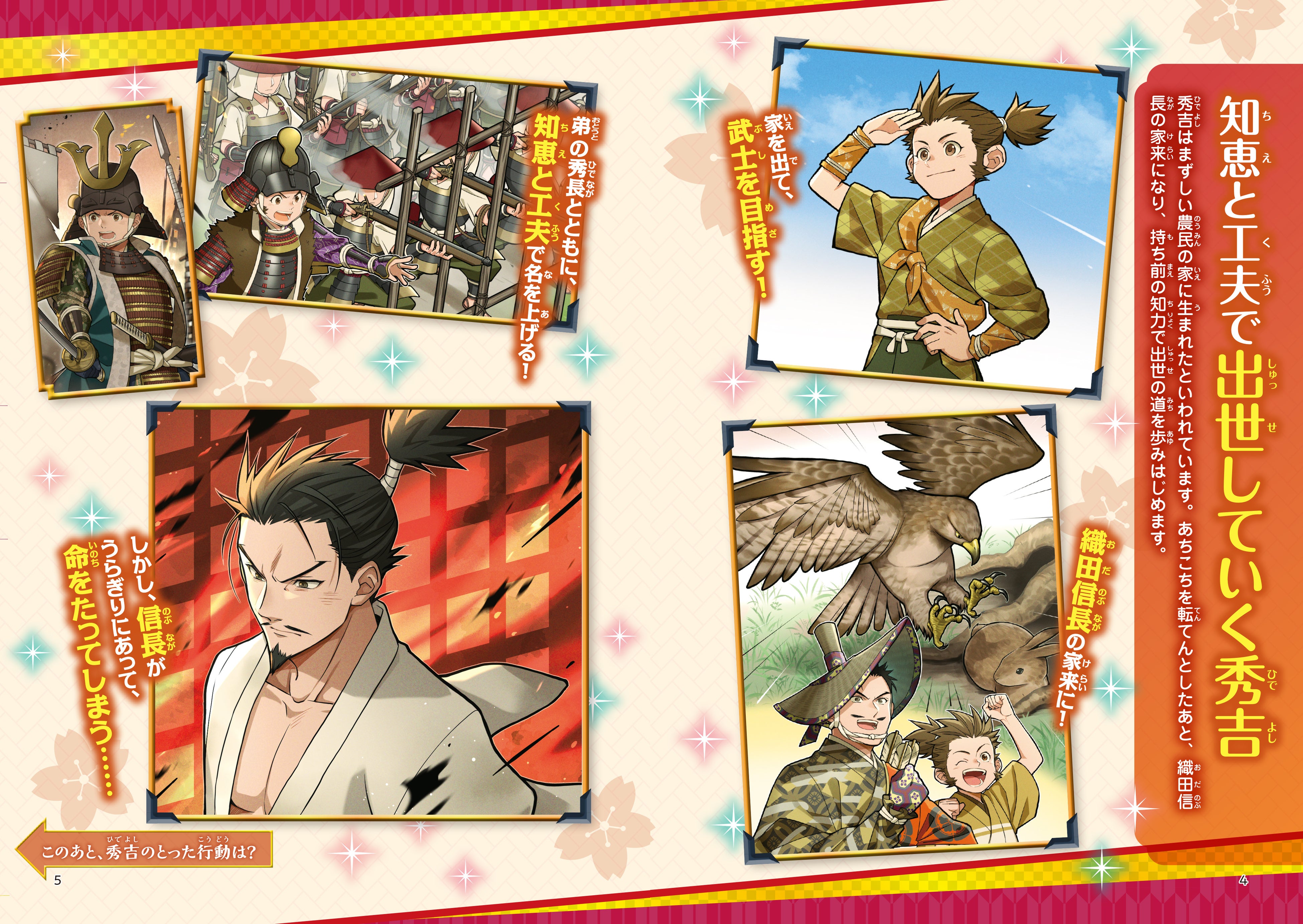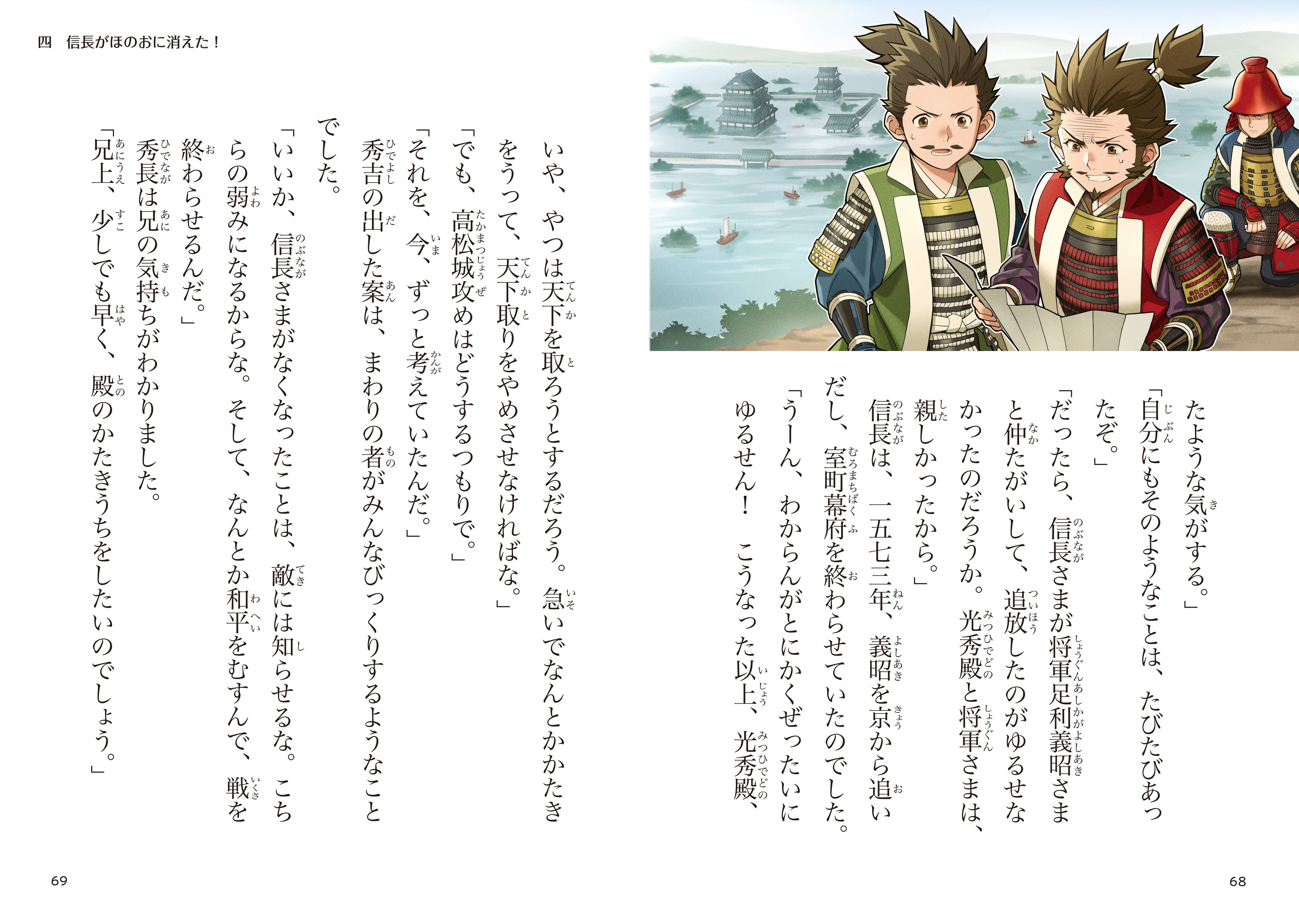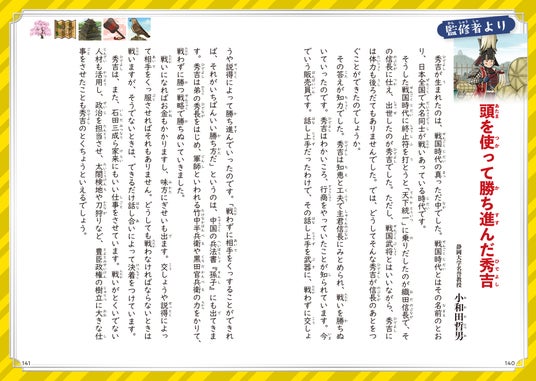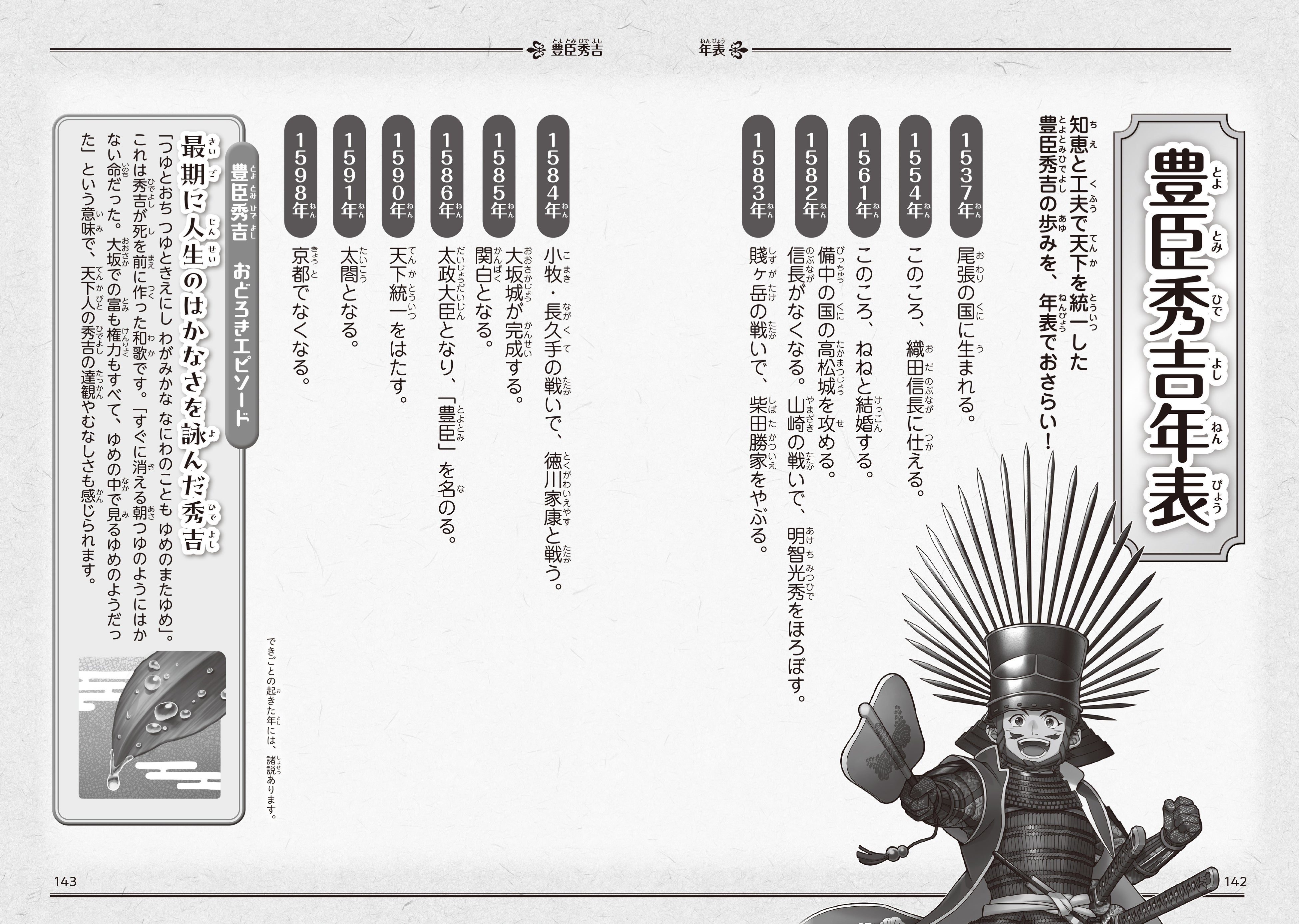 巻頭の「人物ガイド」では、戦国時代の地図や秀吉の性格、登場人物を紹介しています。お話を読む前にイメージがわき、読書を進める際の手助けとなります。また、巻末には年表や秀吉のエピソードも掲載しています。