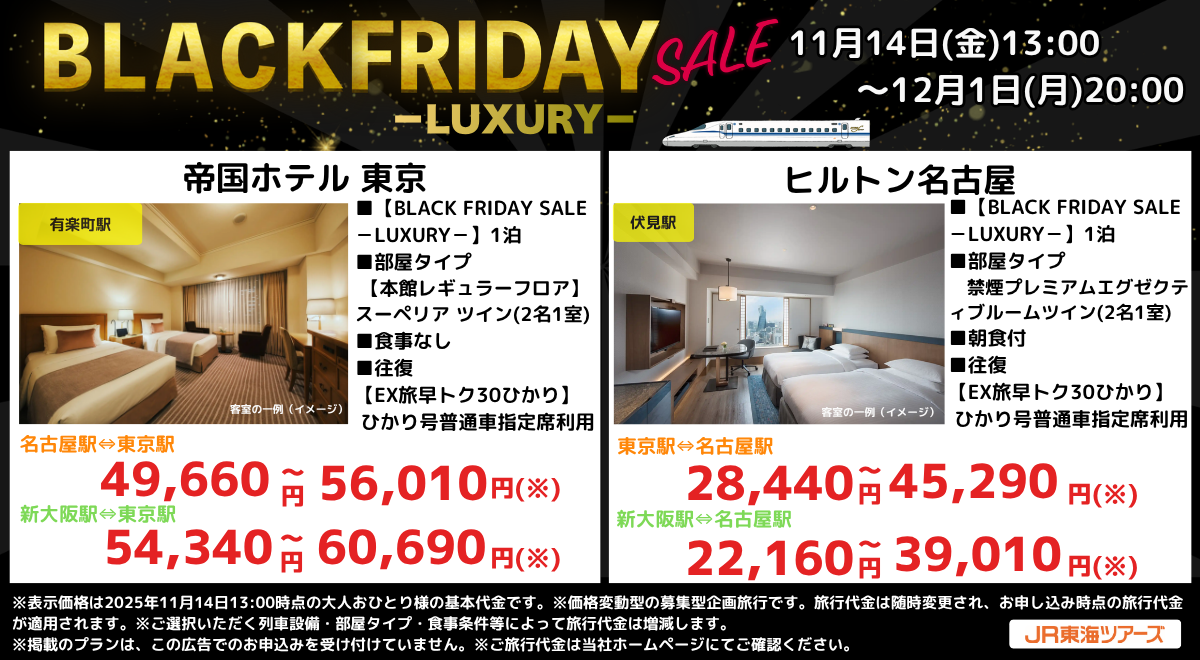 株式会社ジェイアール東海ツアーズ株式会社ジェイアール東海ツアーズ(本社:東京都中央区、以下JR東海ツアーズ)は、2025年11月14日(金)から12月1日(月)までの期間限定で「BLACK FRIDAY SALE」を開始いたしました。1月以降出発の「新幹線+ホテル」を期間限定の衝撃価格でご予約いただけます。コスパ重視のホテルから憧れのラグジュアリーホテルまで多彩なラインナップからお選びください。一年に一度のお祭りセールで新幹線旅行をおトクに予約できるこの機会をお見逃しなく!