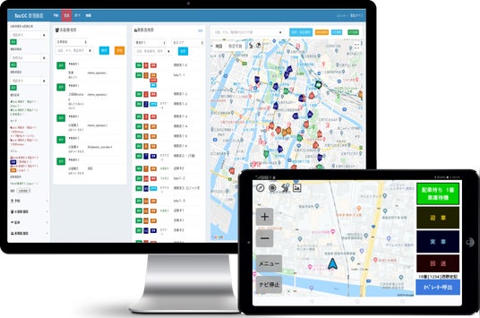 クラウド型タクシー配車システム「DS」は、配車オペレーター用画面とドライバー用車載タブレットをセットにした配車システムで、タクシー事業者の業務効率化を実現します。現在、全国47都道府県で約600社・約2万2000台のタクシー車両に導入されています。