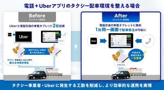 電脳交通の配車システム「DS」と「Uberアプリ」を連携させることで、タクシー事業者は、電話およびUberアプリからのタクシーの配車依頼を、電脳交通の車載タブレット1台で同一画面にまとめて受けられるようになります。さらに、電脳交通がタクシー事業者とUberアプリ間で発生するオンボーディングや契約、支払いなどの手続きを一元管理することで、双方に発生する工数を削減し、より効率的な運用を実現します。