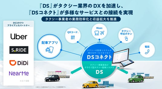 「DSコネクト」は、電脳交通のクラウド型配車システム「DS」と、配車アプリや交通関連サービスを連携させるシステムです。タクシー事業者の業務効率化と収益機会の最大化を目的とし、配車チャネルの拡充と運用負荷の軽減を同時に実現します。 2025年2月より「DSコネクト」アライアンスパートナーとしてUberが参画し、国内47都道府県・約600社・約2万2000台のタクシー車両に導入されているクラウド型配車システム「DS」と、世界70カ国以上で展開されている「Uberアプリ」とのシステム連携が可能となりました。