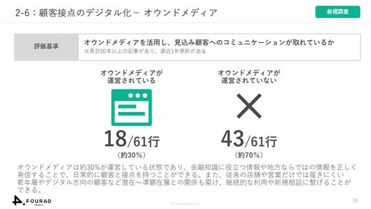 - 約30%の銀行がオウンドメディアを運営し、累計20本以上の記事を公開している。金融知識に役立つ情報や地方ならではの情報を発信しており、従来の店舗や営業だけでは届きにくい若年層やデジタル志向の顧客など潜在層との関係構築につなげている