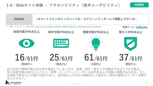 - 弱視・ロービジョンユーザーに対する問題が10個以上の銀行は全体の約72%。音声ユーザビリティに関する全項目で90点以上の評価となった銀行は0行。Webアクセシビリティ対応への改善余地は大きい(※3)