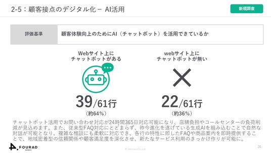 - Webサイト上にチャットボットがある 39/61行(約64%)