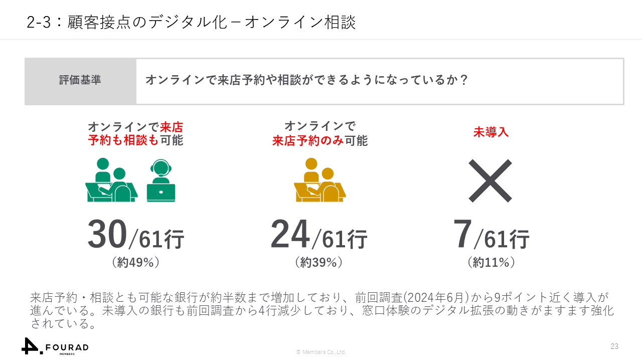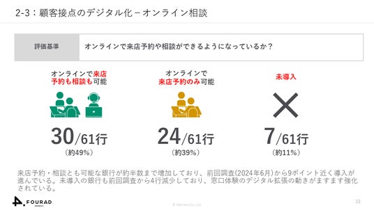 - 前回調査から来店予約・相談とも可能な銀行は9ポイント増加し、全体の約49%となった。未導入の銀行も前回調査から4行減少し、窓口体験のデジタル拡張の動きがますます強化されている