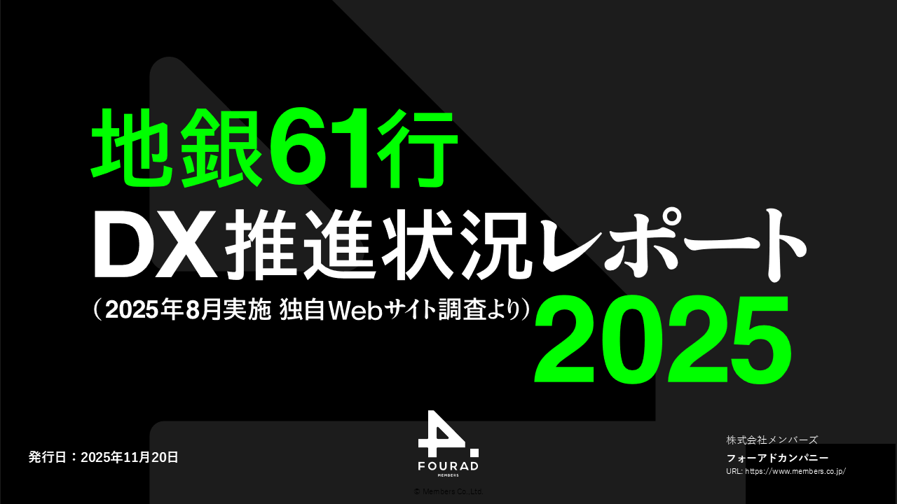 DX現場支援で顧客と共に社会変革をリードする株式会社メンバーズ(本社:東京都中央区、代表取締役社長:高野 明彦、東証プライム:2130、以下「メンバーズ」)は、全国の地方銀行61行を対象に「Webサイト体験」と「顧客接点のデジタル化」の推進状況を評価した「地銀61行 DX推進状況レポート2025」を発表します。
