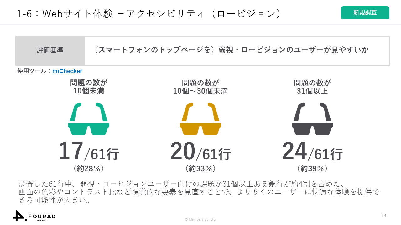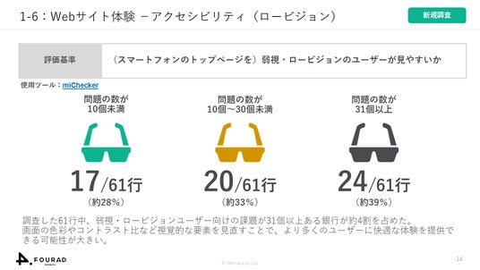 - 弱視・ロービジョンユーザー向けの色彩やコントラスト比の見直しなどの問題が10個以上ある銀行が約72%。問題が31個以上ある銀行は約39%。Webアクセシビリティの観点で視覚的な要素の見直しが求められる