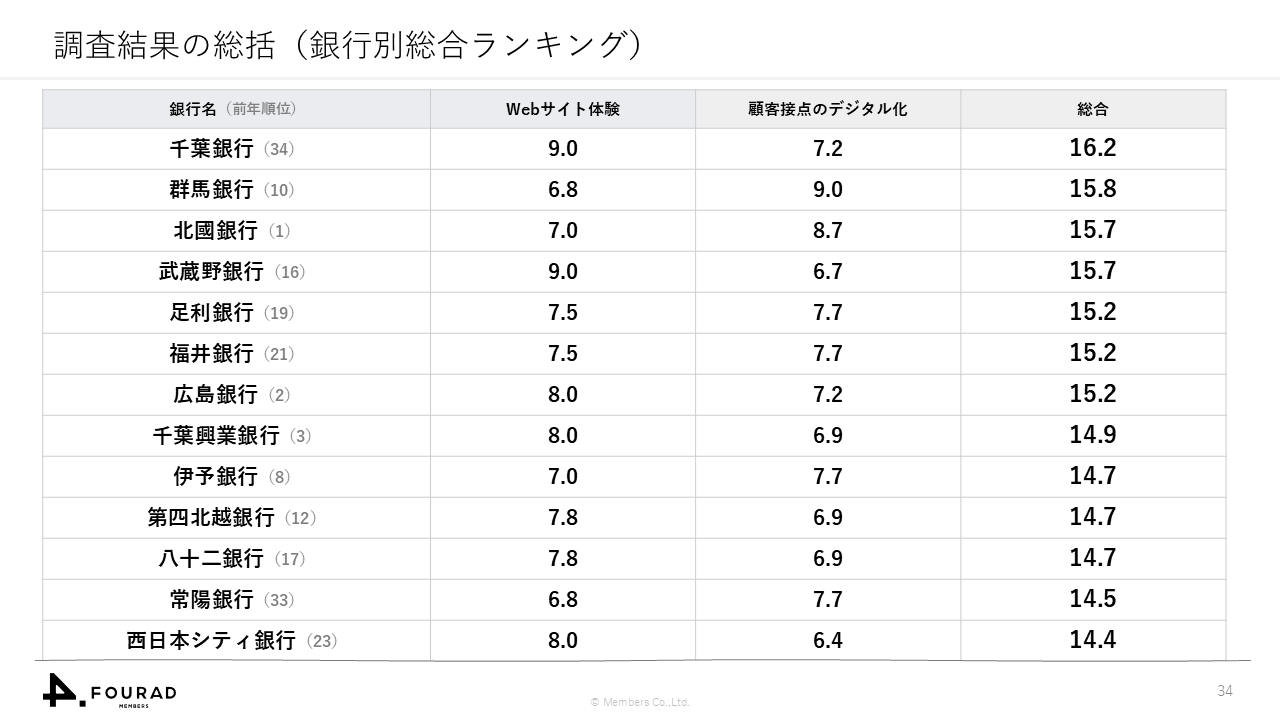 メンバーズWebサイト体験と顧客接点のデジタル化を14項目で評価。地銀の総合ランキングを発表