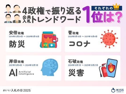 労働力不足問題解決のリーディングカンパニーとして、複数の SaaS を展開する株式会社うるる(本社:東京都中央区、代表取締役社長 CEO:星 知也、以下「うるる」)が運営する入札情報速報サービス「NJSS(エヌジェス)」は、「いい入札(11・23)の日」を目前に控えた本日、安倍・菅・岸田・石破の 4 政権の政策方針が入札にどう表れたのかを示す『公共入札トレンドワード』を公開しました。さらに、高市新政権の発足を受け、今後の『公共入札トレンド予測』も併せて発表いたします。