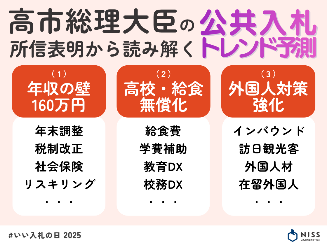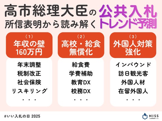 【いい入札の日 2025:公共入札トレンド予測発表】高市政権発足で公共入札はどう動く?「年収の壁 160 万円」「高校・給食無償化」「外国人対策強化」に注目
