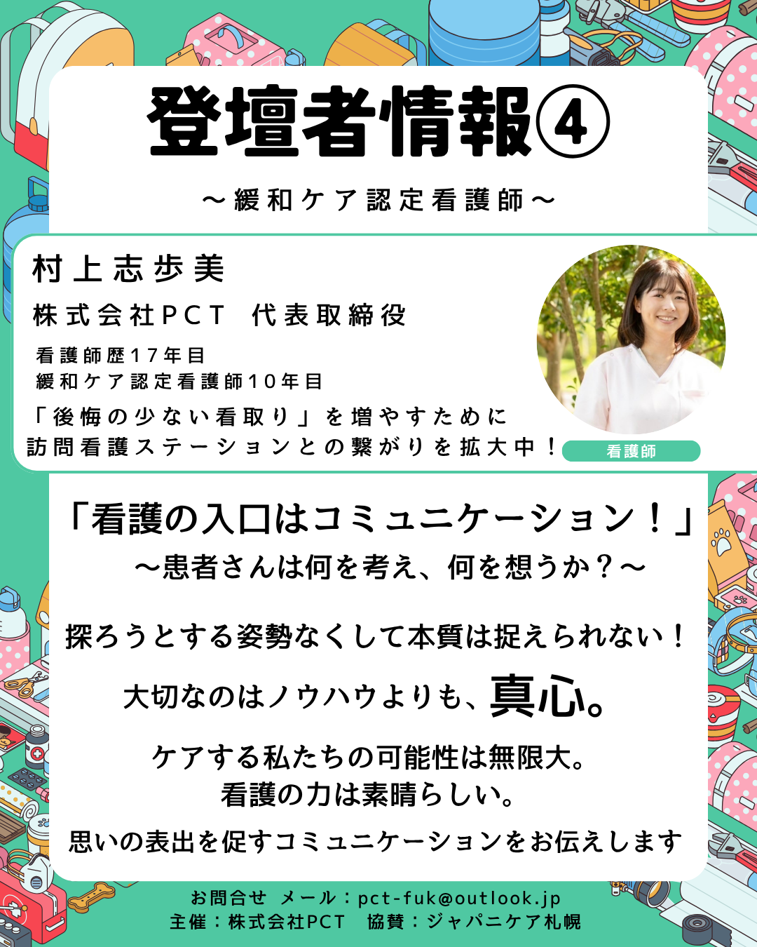 4. 株式会社PCT 代表取締役/緩和ケア認定看護師 村上志歩美「看護の入口はコミュニケーション~患者は何を考え、何を想うのか~」