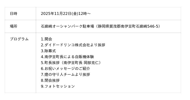 燈の守り人のキャラクター活用権を有する南伊豆町の地域活性化を目的とし、2025年11月22日(土)、ダイドードリンコ株式会社(本社:大阪市北区)とコラボした『燈の守り人自動販売機』を石廊崎(静岡県賀茂郡南伊豆町)に設置いたしました。そしてこの度、石廊崎オーシャンパークの駐車場にて除幕式を開催。当日は、南伊豆町の岡部克仁町長や『燈の守り人』総合プロデューサーの波房も参加し、連携を強化する機会となりました。また、当日はツーリストシップの「旅先クイズ会」も同時開催され、会場は大いに賑わいました。