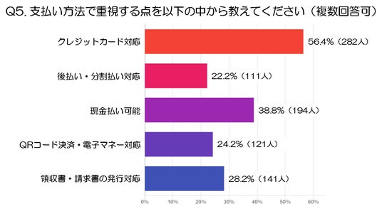- 「後払い・分割払い対応」(22.2%)はやや少なめですが、急な出費に備えたい人や金額が大きくなる可能性を想定している人にとっては便利な仕組みとして受け止められていると推測されます。