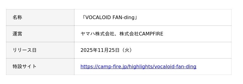 ヤマハ株式会社ヤマハ株式会社(以下、当社)と、クラウドファンディング事業の企画・開発・運営を手掛ける株式会社CAMPFIRE(本社:東京都渋谷区猿楽町18−8ヒルサイドテラスF棟201、代表取締役:中島真、以下CAMPFIRE)は、11月25日(火)からボカロに“なりたい”から“なれる”を実現するクラウドファンディング型ボカロ化支援サービス「VOCALOID FAN-ding」を開始します。