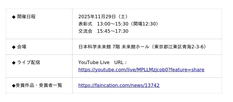 一般社団法人日本金融教育支援機構(共同代表理事:平井梨沙 阿部奈々、東京都千代田区)は、2025年11月29日(土)、東京お台場の日本科学未来館 7階 未来館ホールにて「第3回FESコンテスト Supported by ゆうちょ銀行」表彰式を開催します。
