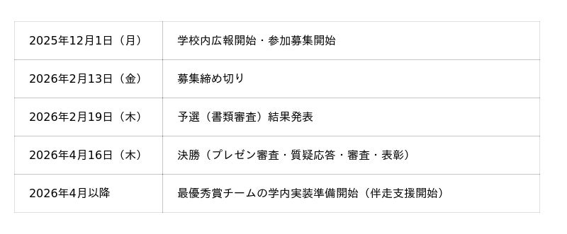 こうした歩みを踏まえ、10周年の節目として新たな一歩を記念する企画として、「キャンパスアイデア甲子園」を開催いたします。本イベントでは、学生自身がキャンパス生活の中で感じる課題に対して具体的な解決策や改善策を考え、提案することを通じて、より良い学校生活の実現につながる実践的な学びの機会を提供します。応募作品は単なるアイデアにとどまらず、最優秀賞に選ばれた提案については、静岡大学イノベーション社会連携推進機構および当社の伴走支援のもと、学生の手で学内での実装を目指します。本イベントでの課題発見・解決・実装の一連の経験は、アイザワゼミが掲げる「次世代アントレプレナーシップ育成」の理念にも直結しており、学生が将来の起業や事業創造に必要な基礎力を身につける機会にもなります。本イベントの最大の特徴は、「学生のアイデアを本当に形にする」ことです。学生生活の中で感じる不便や「こうだったらいいのに」という率直な想いを、現実的な仕組みへと昇華させる機会を提供し、学生の主体性や実行力を育むことを目指しています。また、本取り組みは直接的には「キャンパス課題の解決」を目的としていますが、学生が自ら課題を発見し、解決策を提案し、実行へ向けて関係者と対話するという一連のプロセスは、将来の社会で求められる実践的な力にもつながります。結果として、こうした取り組みが地域や社会の課題解決へと自然に波及していくことも期待しています。将来的には地域や社会の課題解決にもつながる可能性を秘めていますが、まずは学生が主体的に考え、学校生活をより良くすることを第一の目的としています。